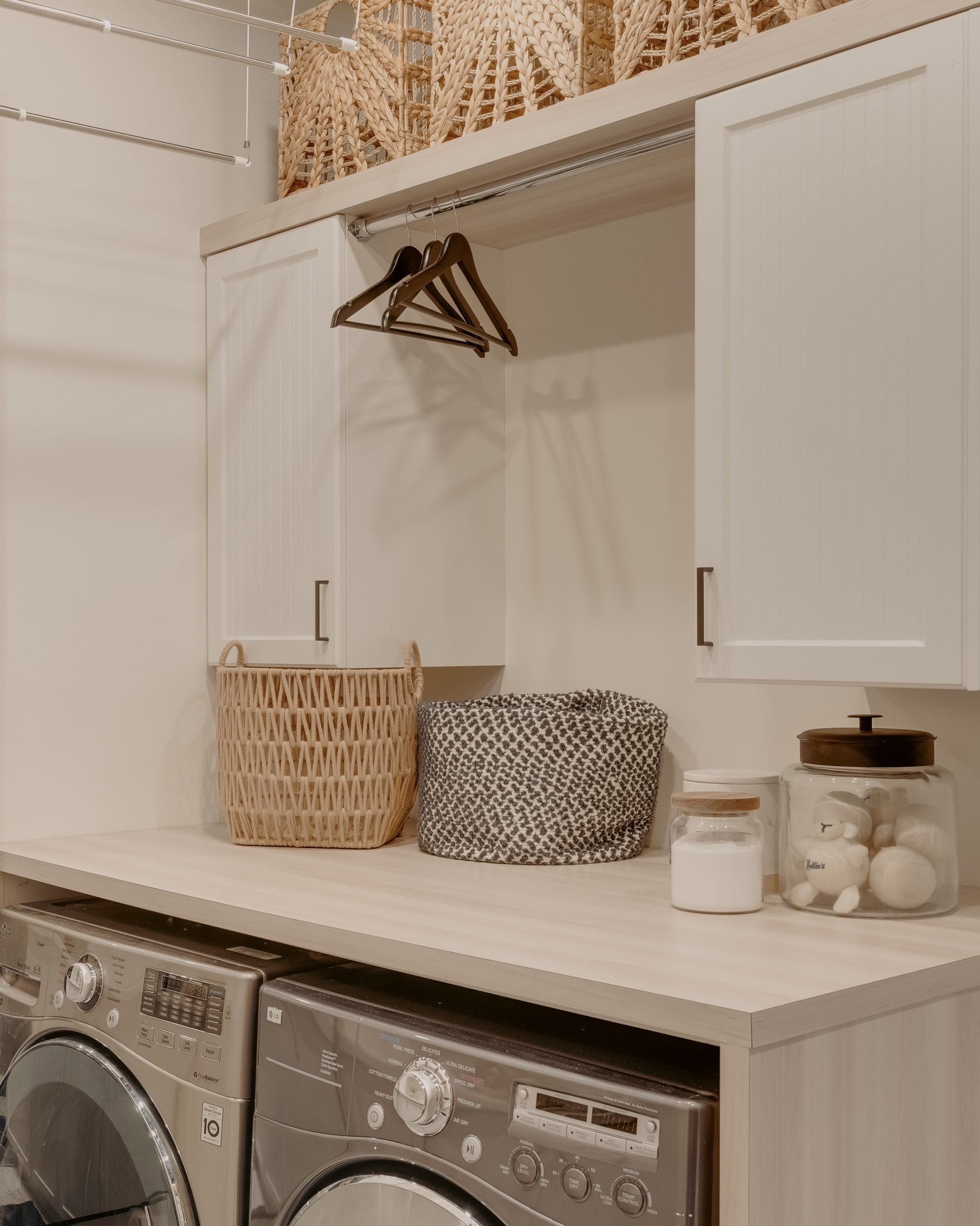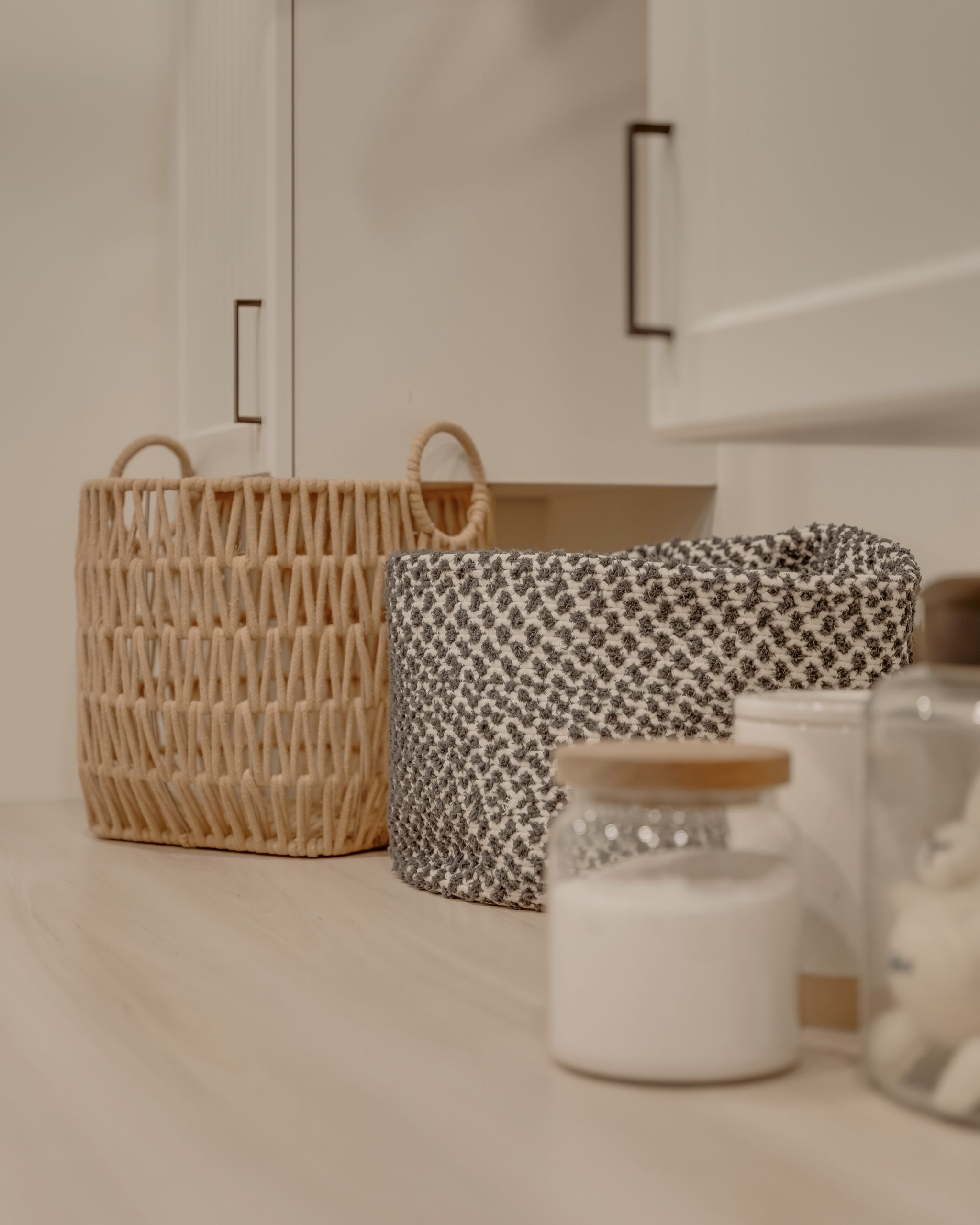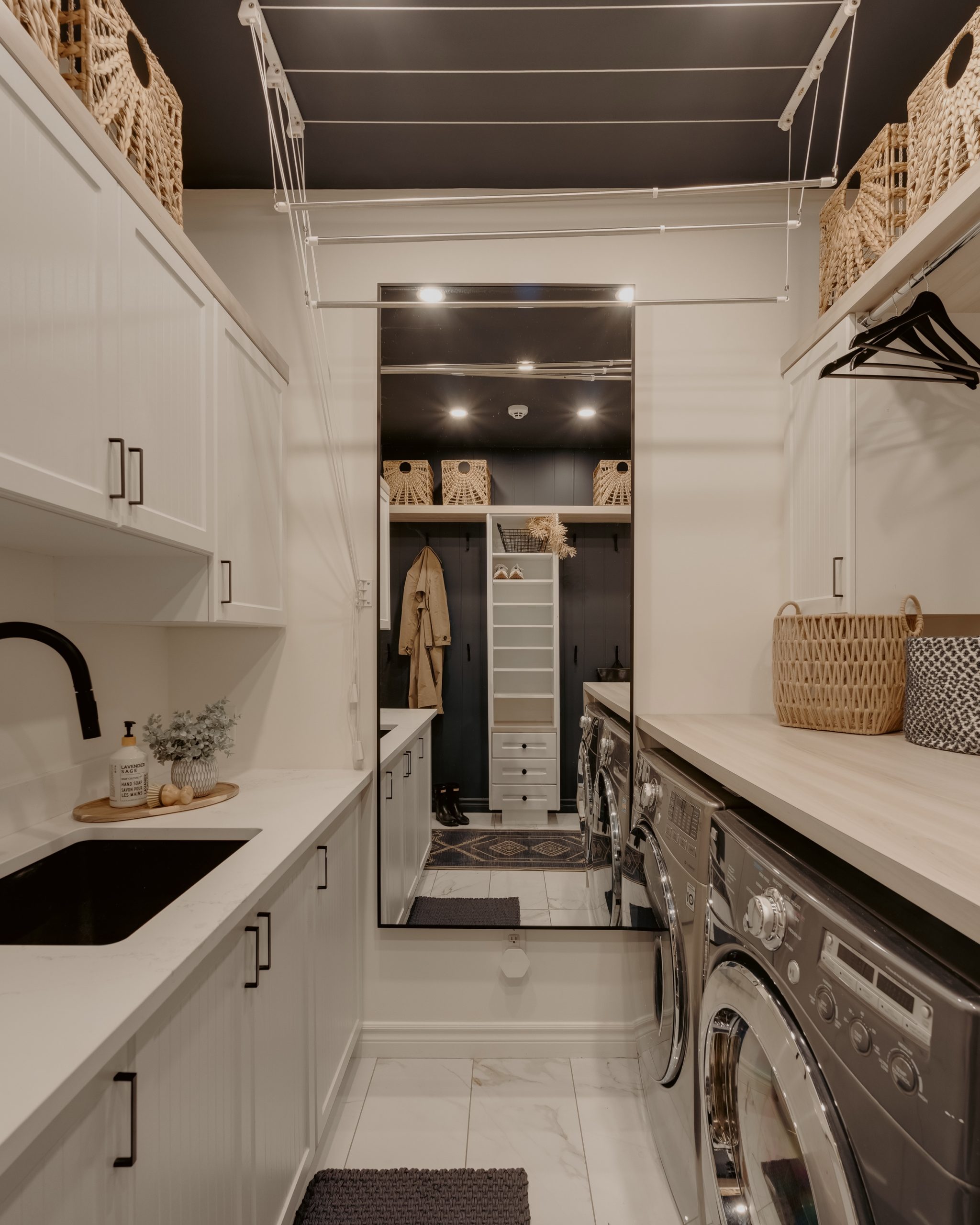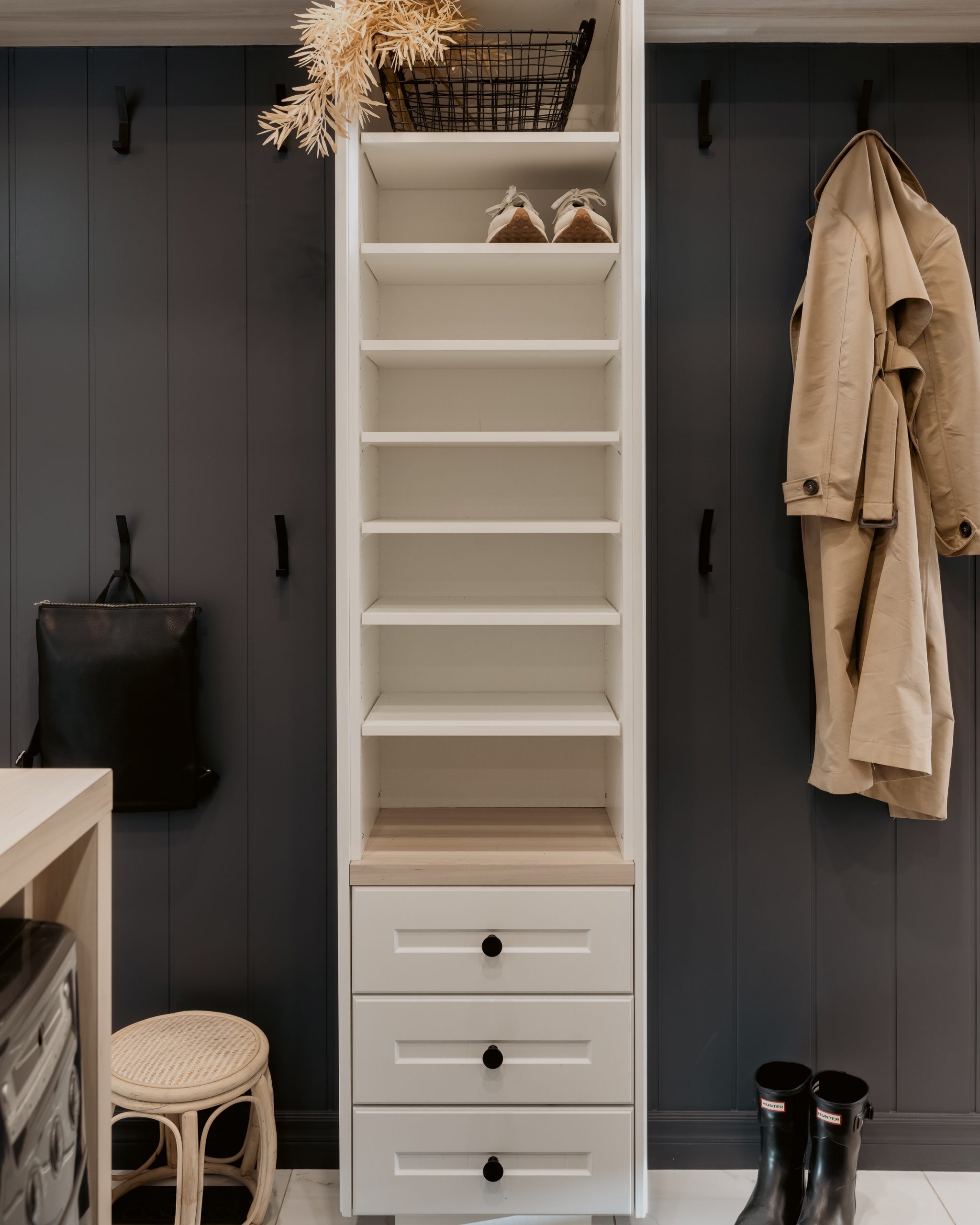 Nous avons récemment transformé une zone buanderie et mudroom en un espace à la fois fonctionnel, esthétique et respectueux de l’environnement. Ce projet a consisté à simplifier l’espace en retirant certaines moulures superflues pour laisser place à des unités de rangement créatives et pratiques, parfaitement adaptées aux besoins quotidiens.